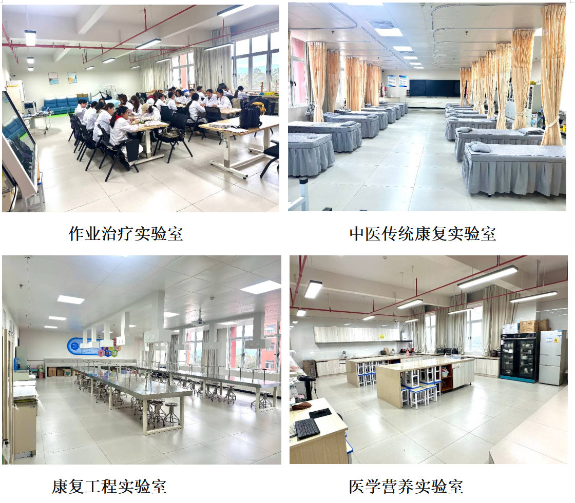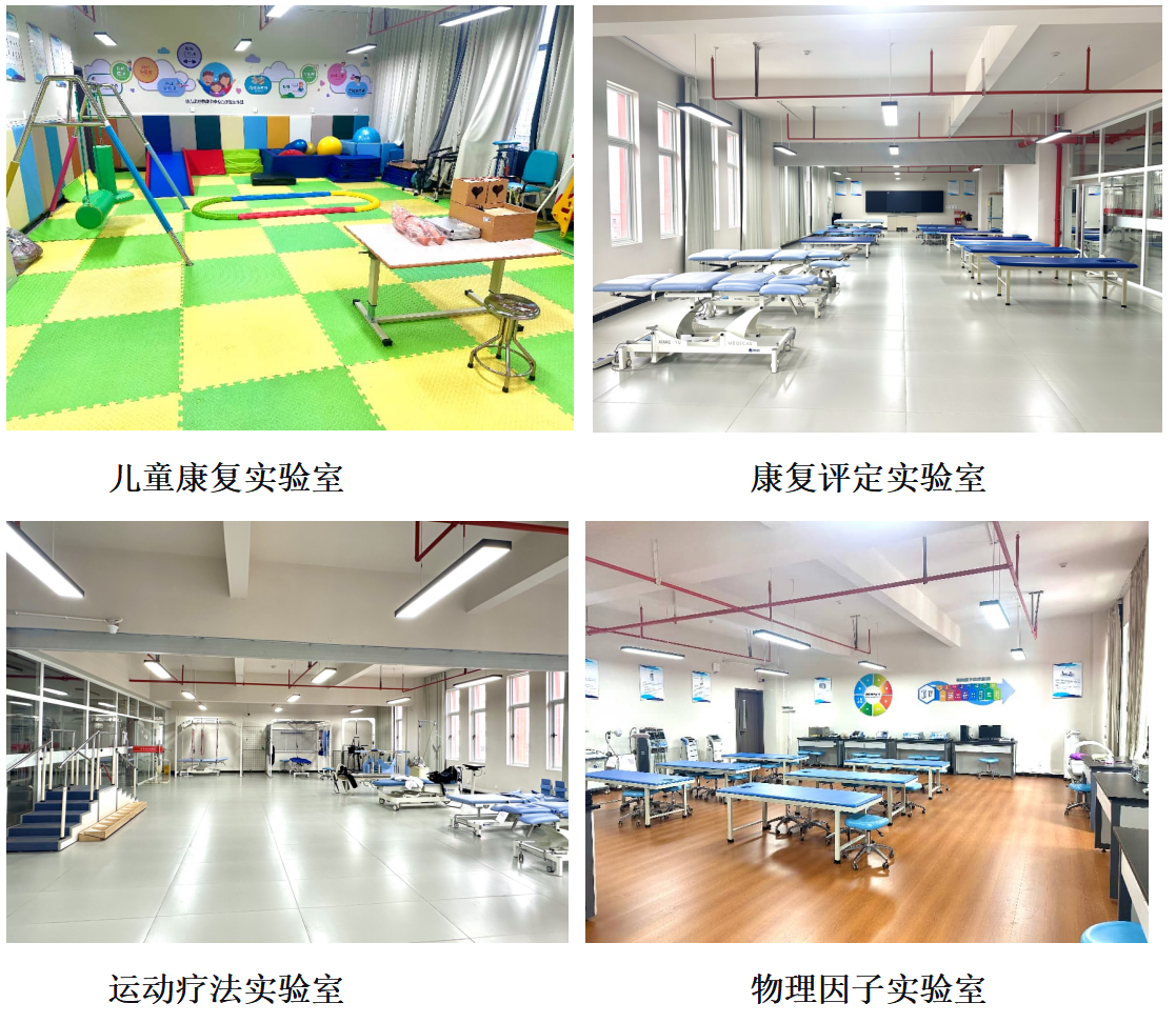 康复治疗学专业拥有较好的校内实验教学平台。专业现拥有校内本专业实验室10间,建筑面积1290㎡,拥有包括运动疗法实验室、吞咽言语&作业治疗实验室、物理因子治疗实验室、康复工程实验室、儿童康复实验室、中医传统康复实验室、ADL模拟家居实验室、中医推拿实验室、医学营养实验室和医疗美容实验室等10个不同功能的实验区,区域内配备有各类康复治疗学实验教学相关设备200余台(套),价值在681.1万元,生均2.23万元。
